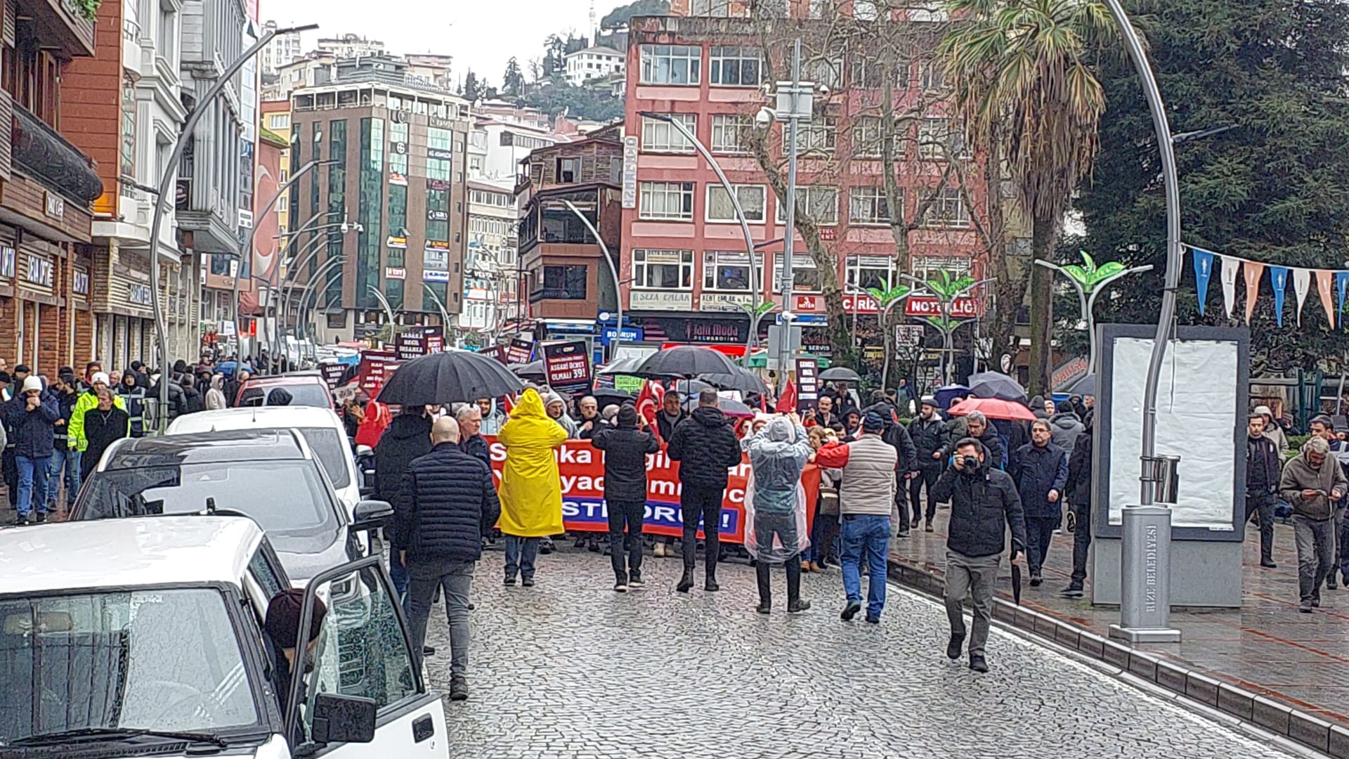 Rize Cumhuriyet Meydanı’nda toplanan yurttaşlar, “Direne direne kazanacağız”, “Hak, hukuk, adalet”, “Sadaka değil, insanca yaşayacak ücret istiyoruz”, “Emekçiler burada, iktidar nerede” sloganlarıyla Atatürk Caddesi üzerinden yürüyerek Cumhuriyet Caddesi’ndeki Rize Kültür Müdürlüğü önüne geldi.