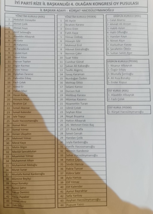 Konuşmaların ardından gerçekleştirilen seçimde mevcut başkan Av. Kürşat Hacısüleymanoğlu tek listeyle girdiği yarışta bütün oyları alarak yeniden İYİ Parti Rize İl Başkanı seçildi.
