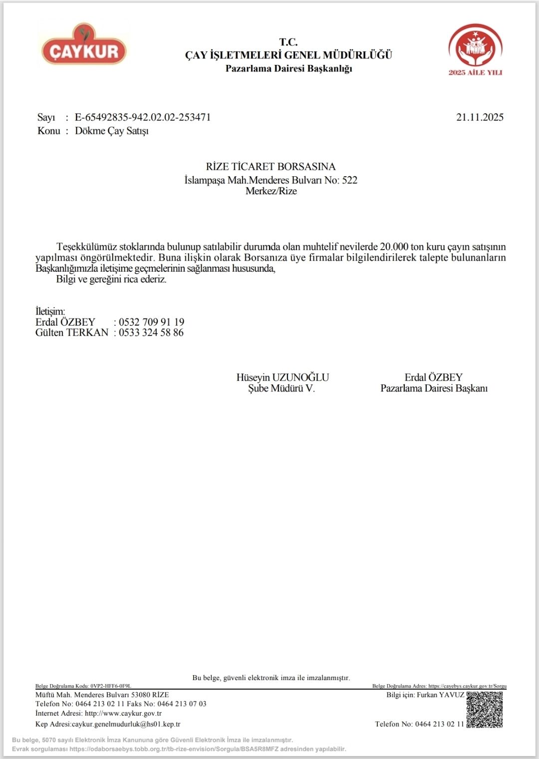 Ancak tartışma burada bitmedi. Mehmet Erdoğan’ın çıkışından sadece günler sonra, bu kez Çaykur Genel Müdürü Yusuf Ziya Alim’in, kurumun depolarında bulunan hazır kuru çayı özel sektör firmalarına satmak için Rize Ticaret Borsası üyelerine resmi yazı göndermesi yeni bir krizin kapısını araladı.