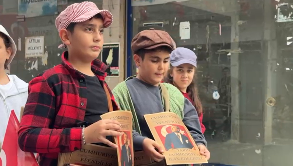 Fındıklı Belediyesi Çocuk Meclisi üyeleri, 28 Ekim 1923 gününün atmosferini canlandırdıkları özel bir çalışma ile Cumhuriyet’in ilanından bir gün öncesine yolculuk yaptılar. Cumhuriyet Caddesi boyunca yürüyen çocuklar, “Yazıyor, yazıyor, yazıyor! Yarın Cumhuriyetin ilan edileceği yazıyor” nidalarıyla dikkat çekti.