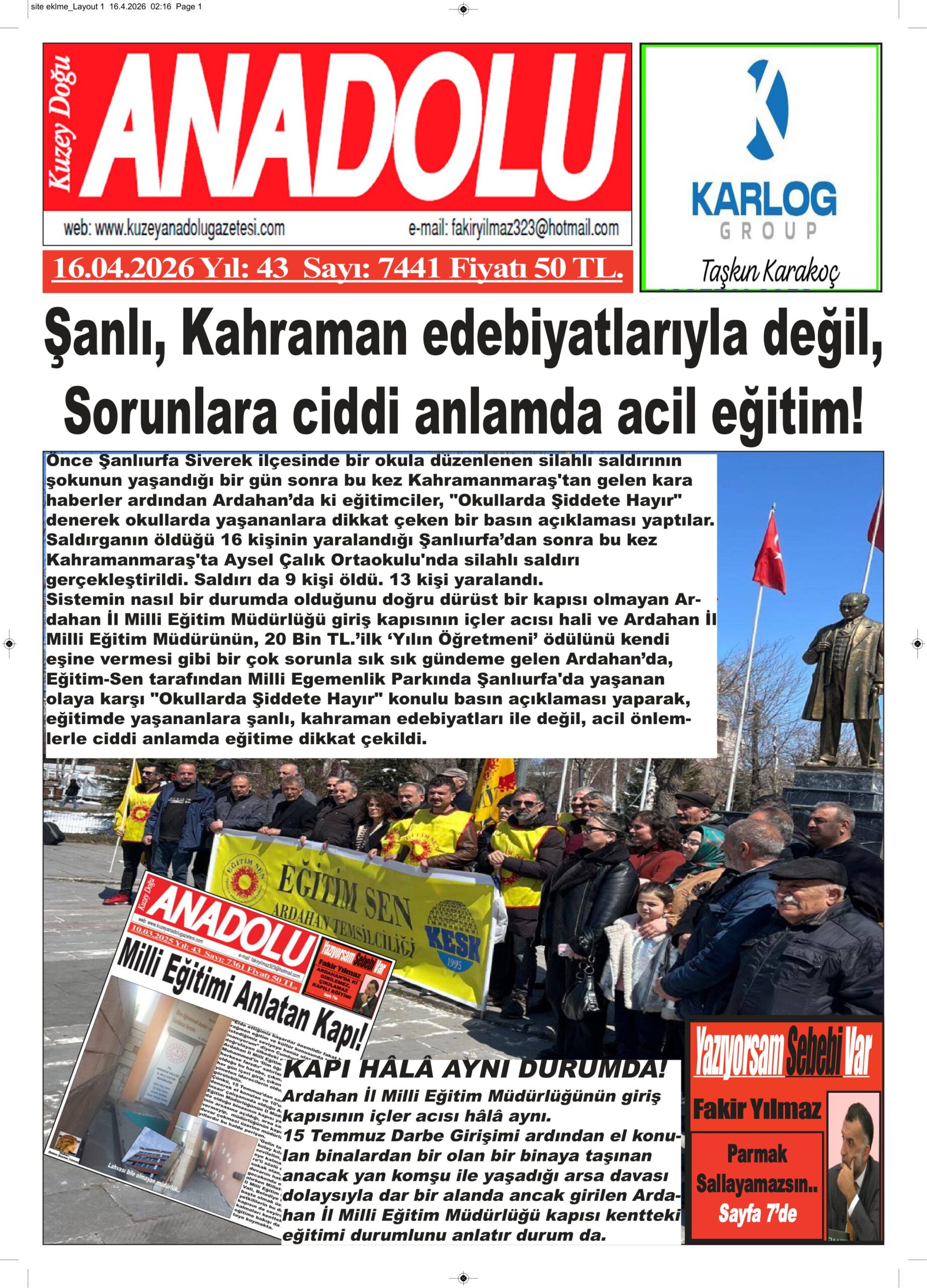 Kendisi gibi eski Ardahan Milletvekili olan ve iki dönem milletvekilliği yapmasına karşın ve şu an kurduğu partinin genel başkanı olarak Gürcistan ve Ermenistan’a sınır, bir demiryolu olmak üzere 3 gümrük kapısı olan Ardahan’da neden bir konsolosluk yok demeyen Büyükelçi olan Öztürk Yılmaz gibi basın ve medyada yer verilmezler durumuna düştüğünden kobuğ yemişler diyen benim ikinci tezim olarak adlandırdığım çeper dibi dediğim sanaldan başka bir yayın aracı bulamayan hale düşmüş olan Saffet’i dinleyip, haline gülerken, muhabirimizin, ‘Al abi senin yaza yaza, söyle söyle kurutacağım diye kendini paraladığın memleketinin eğitimden sorumlularının bol maaşlarla oturdukları İl Milli Eğitim Binasının giriş kapısı..’ notu ile bana gönderdiği iki fotoğraf karesine bakarken, sinirden beynine kan vurmuş biri gibi gelmiş, geçmişlere tükürmek pardon türkücülerde olan ama kent merkezinde olmayan Ardahan güllerini değil hımmmmmmm diye selamlar gönderip, ağladım desem inanın.