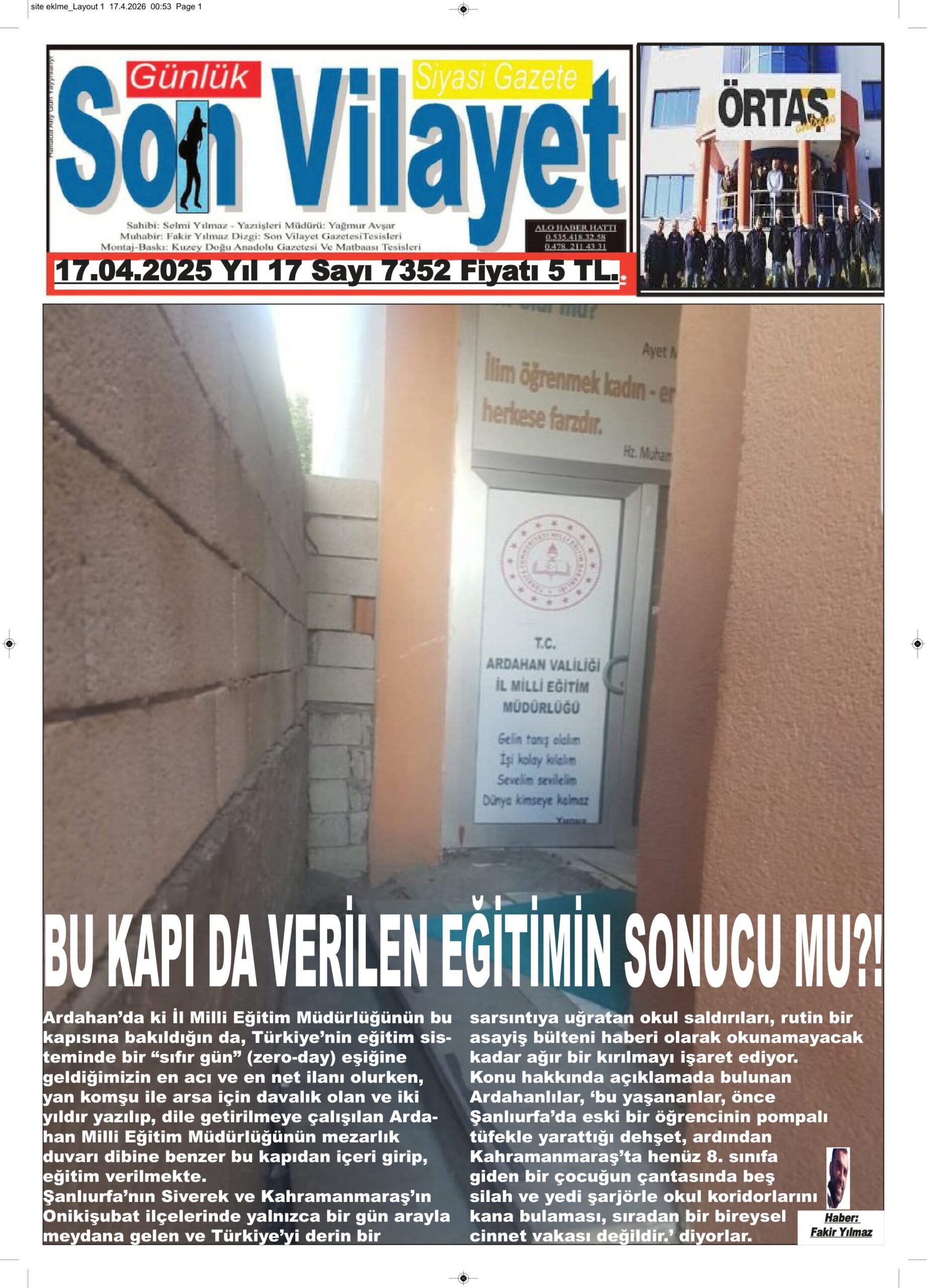 ‘Sayın Vekil, Sayın Vali.. Bir yangın çıksa bu kapıdan kim çıkar? Önce Şanlıurfa’da, sonra Kahramanmaraş’ta yaşanan ve ülkeyi şok eden olayların bir kez daha gözler önüne serdiği eğitim sisteminin tartışıldığı günlerde bir mezarlık duvarı dibini andıran Ardahan İl Milli Eğitim Müdürlüğünün binasının bu kapısı, başta çıkabilecek bir yangın veya başka bir olayda nasıl bir olaya neden olacağı merak edildi.’