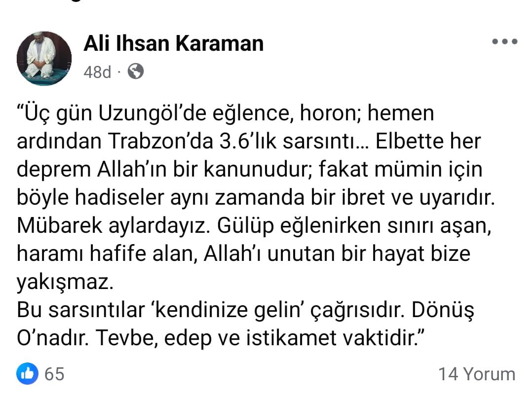 “Üç gün Uzungöl’de eğlence, horon; hemen ardından Trabzon’da 3.6’lık sarsıntı… Elbette her deprem Allah’ın bir kanunudur; fakat mümin için böyle hadiseler aynı zamanda bir ibret ve uyarıdır. Mübarek aylardayız. Gülüp eğlenirken sınırı aşan, haramı hafife alan, Allah’ı unutan bir hayat bize yakışmaz. Bu sarsıntılar ‘kendinize gelin’ çağrısıdır. Dönüş O’nadır. Tevbe, edep ve istikamet vaktidir.”